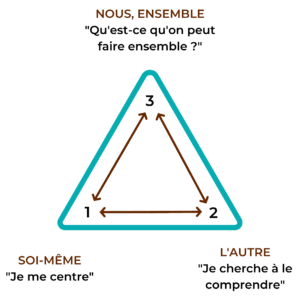 Chaque mouvement combine une technique (ce que nous disons) avec une posture de communication centrée (comment nous le disons). Cette combinaison de formulation et d’attitude permet de désamorcer les conflits en protégeant toutes les parties concernées.